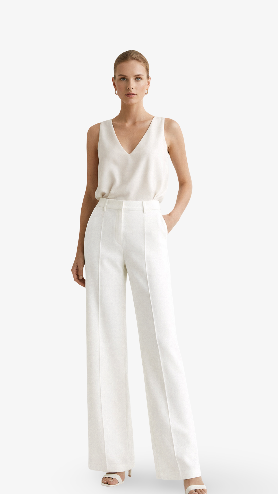 A pair of elegant white trousers designed to create a clean and sophisticated look. The high waist offers a classic, feminine silhouette, while the timeless color makes them easy to style for both everyday wear and special occasions.